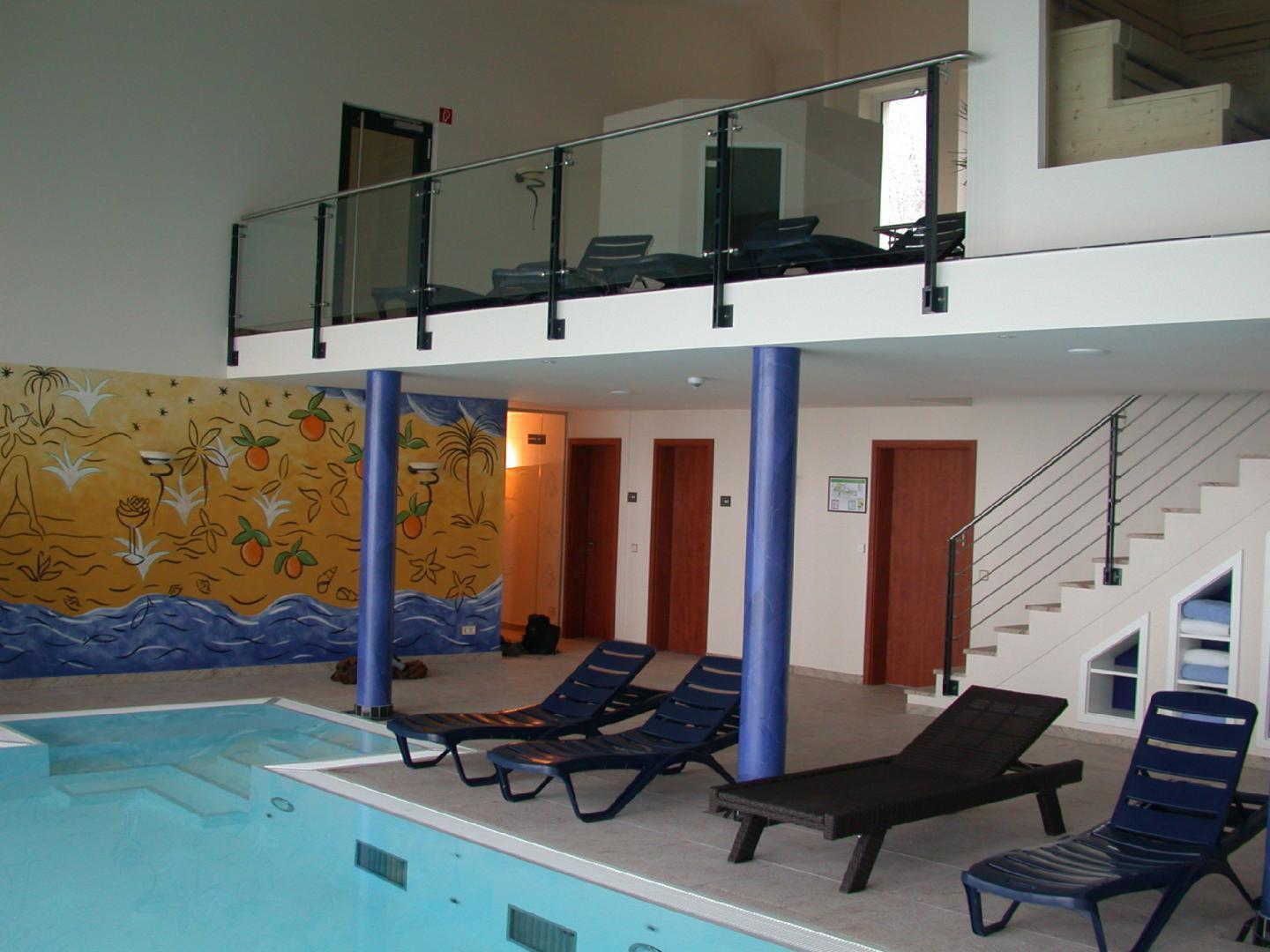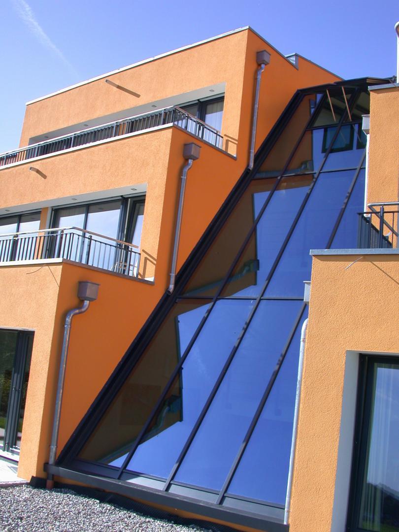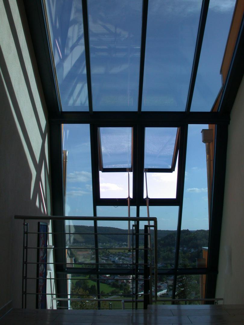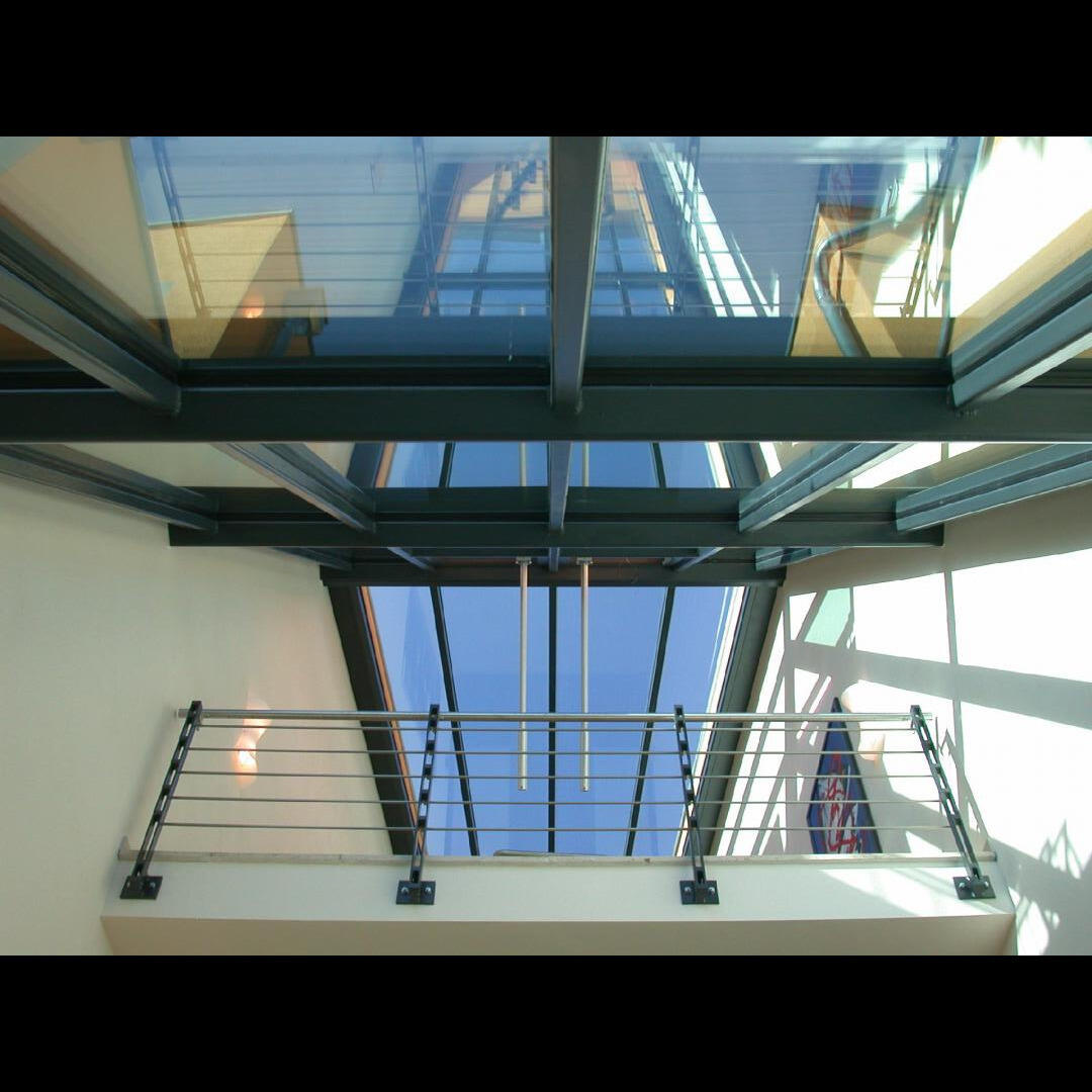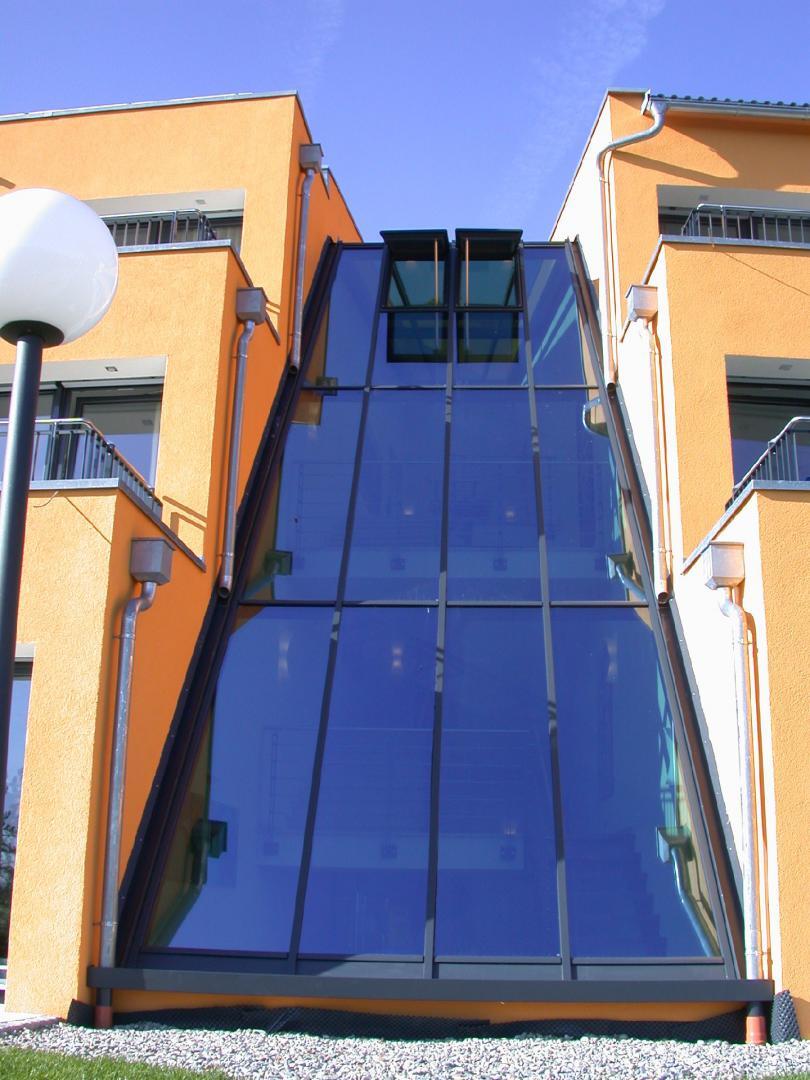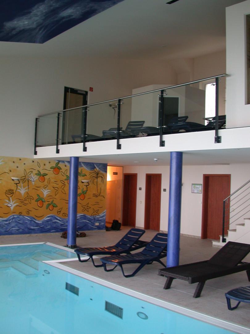 Ausführung der gesamten Schlosserarbeiten in mehreren Bauabschnitten geneigte, konisch zulaufende Stahlunterkonstruktion in pulverbeschichteter Ausführung für Glasfassade. Terrassen- und Balkongeländer in pulverbeschichteter Ausführung mit eingerücktem Edelstahlhandlauf. Elegantes Treppen- und Brüstungsgeländer mit parallel zu Treppe verlaufenden Füllstäben und Handlauf in Edelstahl. Absturzsicherung mit Stahl-/Glasoptik im Wellnessbereich. Verbindungsgang zwischen Gastronomie und Hotelanbau in Stahl-/Glas. |