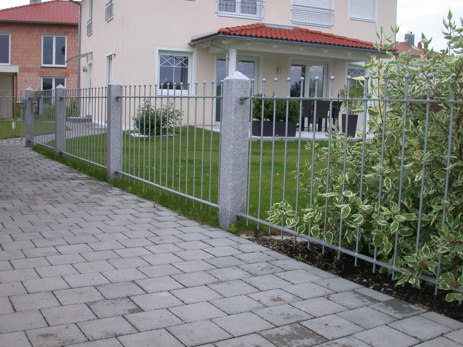 Zeitlose Zaunkonstruktion aus verzinktem Stahl zwischen bauseitigen Granitstehlen montiert. Integrierte Edelstahl-Klingel und Briefkastenanlage. |